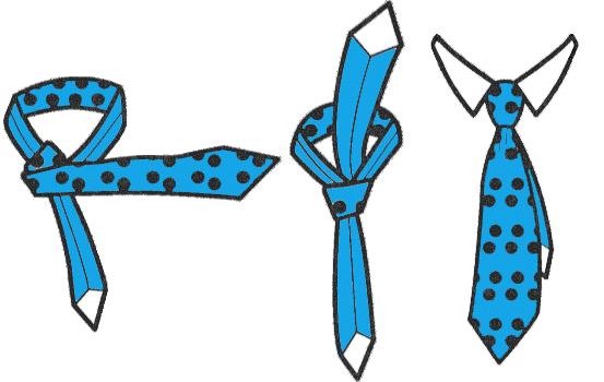 What's interesting about this knot is that you start with the tie inside out. That means turning the pattern inward inside your collar, and having the front of the tie facing backward underneath the tail end. Sounds very strange, yet it all works out as you'll see from the diagrams.